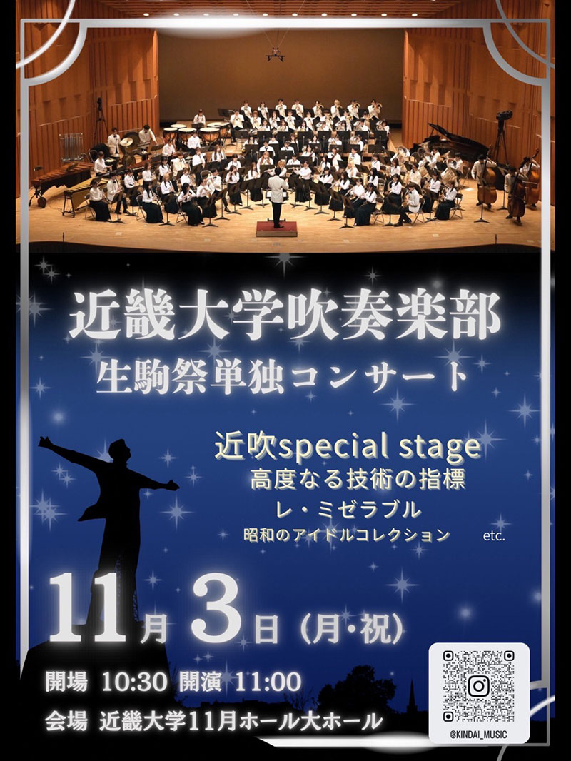 11月3日(月・祝)に近畿大学 11月ホールにて「生駒祭単独コンサート」を開催します。 今年は「万博」をテーマに、音楽で世界をめぐる旅へ皆さまをお連れします。 是非お越しください。